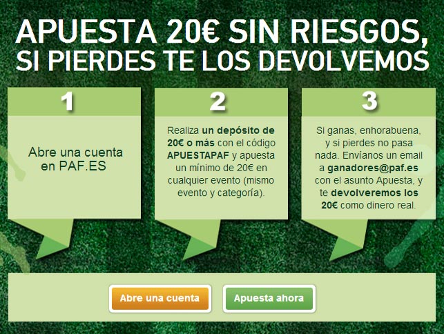 Al registrar una cuenta en esta casa de apuestas deportivas, debes realizar un depósito mínimo de 20 euros y una vez hecho esto puedes obtener el codigo bono Paf con el que se realiza una apuesta segura. Es decir cuando apuestas estos 20 euros, si ganas, el dinero se acredita en tu cuenta; sin embargo si pierdes, la plataforma te devuelve el 100% del monto apostado en un tiempo máximo de 72 horas.